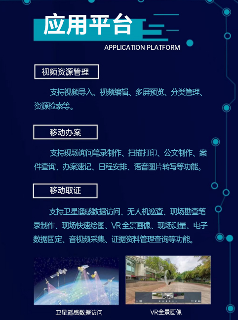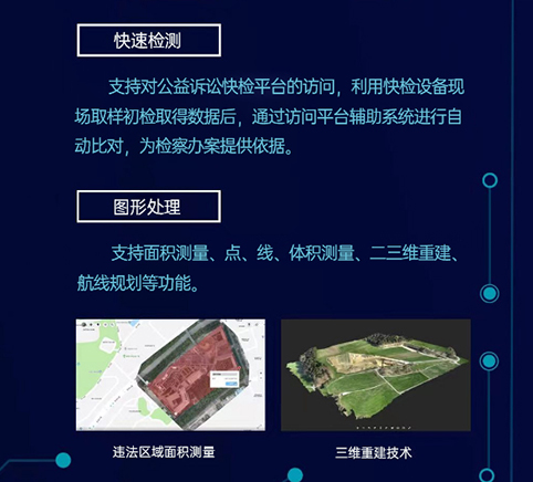 為了實現(xiàn)檢察機關(guān)公益訴訟一體化指揮辦案需求,推動公益訴訟檢察業(yè)務(wù)信息化和智能化建設(shè),針對公益訴訟檢察業(yè)務(wù)特點,設(shè)計開發(fā)了符合其業(yè)務(wù)特色的檢察機關(guān)公益訴訟一體化平臺。該平臺依托公益訴訟移動指揮辦案取證一體機,運用衛(wèi)星遙感、無人機巡航、數(shù)字圖傳、現(xiàn)場勘查 VR虛擬全景畫像、5G移動通信、物聯(lián)網(wǎng)、移動檢測和三維模型重塑等先進技術(shù),結(jié)合同步建設(shè)的沉浸式可視化指揮調(diào)度室、公益訴訟線索輔助管理平臺,構(gòu)成了檢察機關(guān)公益訴訟一體化指揮的三位一體模式。同時該平臺還可廣泛應(yīng)用于公安偵查、法院現(xiàn)場執(zhí)行、行政機關(guān)現(xiàn)場執(zhí)法辦案等場景是執(zhí)法辦案必備的輔助工具。